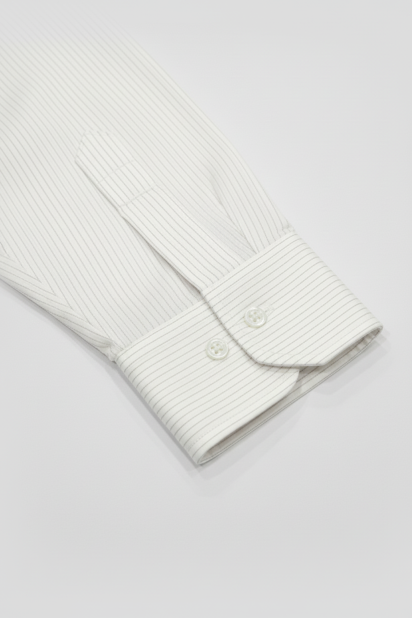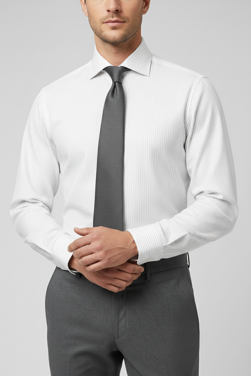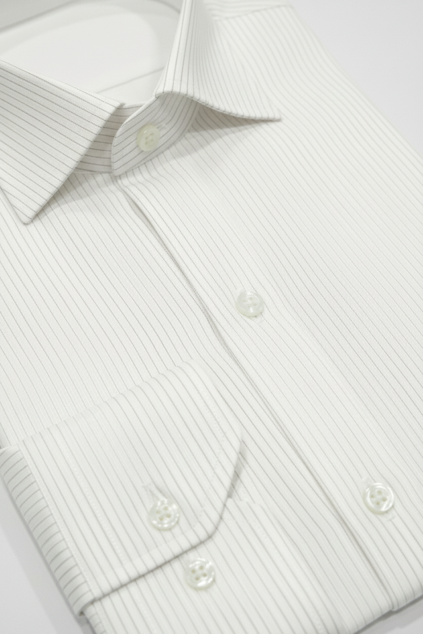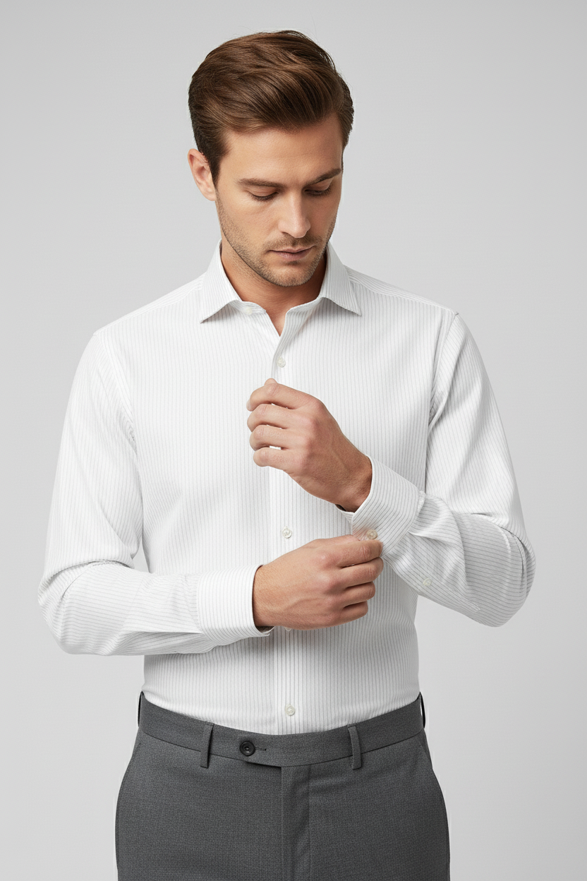 Elevate your wardrobe with this exquisite white striped dress shirt, designed to make a statement on any occasion. Crafted with precision, this shirt combines elegance with a contemporary fit.